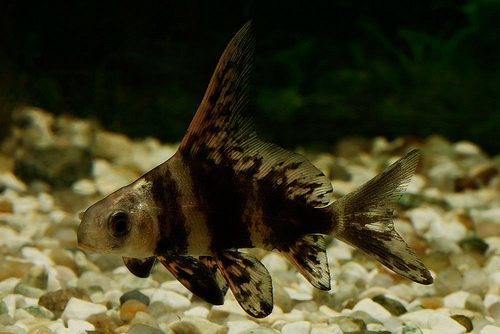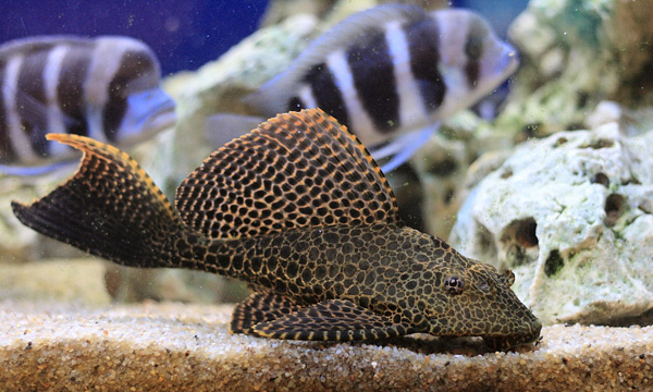 Птерихоплихт Парчевый может достигать в длину 50 см, а продолжительность жизни – до 20 лет. Окрашен он коричневыми пятнами, которые разделены между собой желтыми полосками. Это – очень прожорливая рыба. Она может съедать водоросли в большом количестве; |